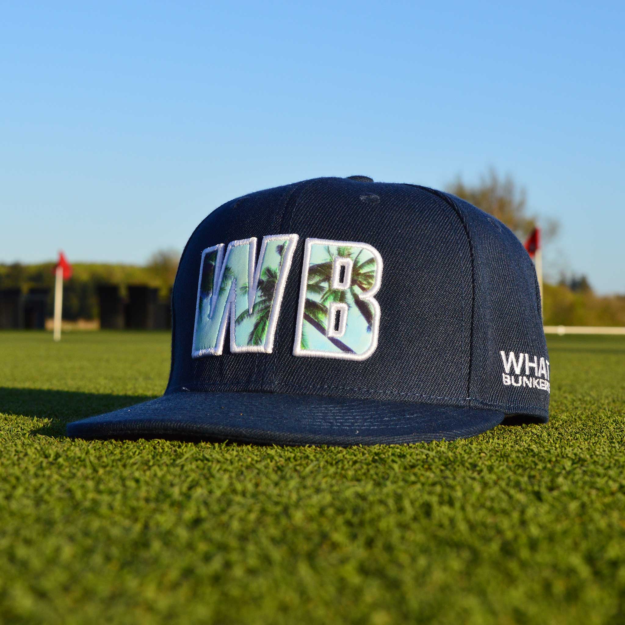 Marinblå keps med platt brätte med WB-bokstäver med palmtema på framsidan. Känner mig lite Hawaii som. Leta inte längre – Skaffa kepsen för att passa den atmosfären.
