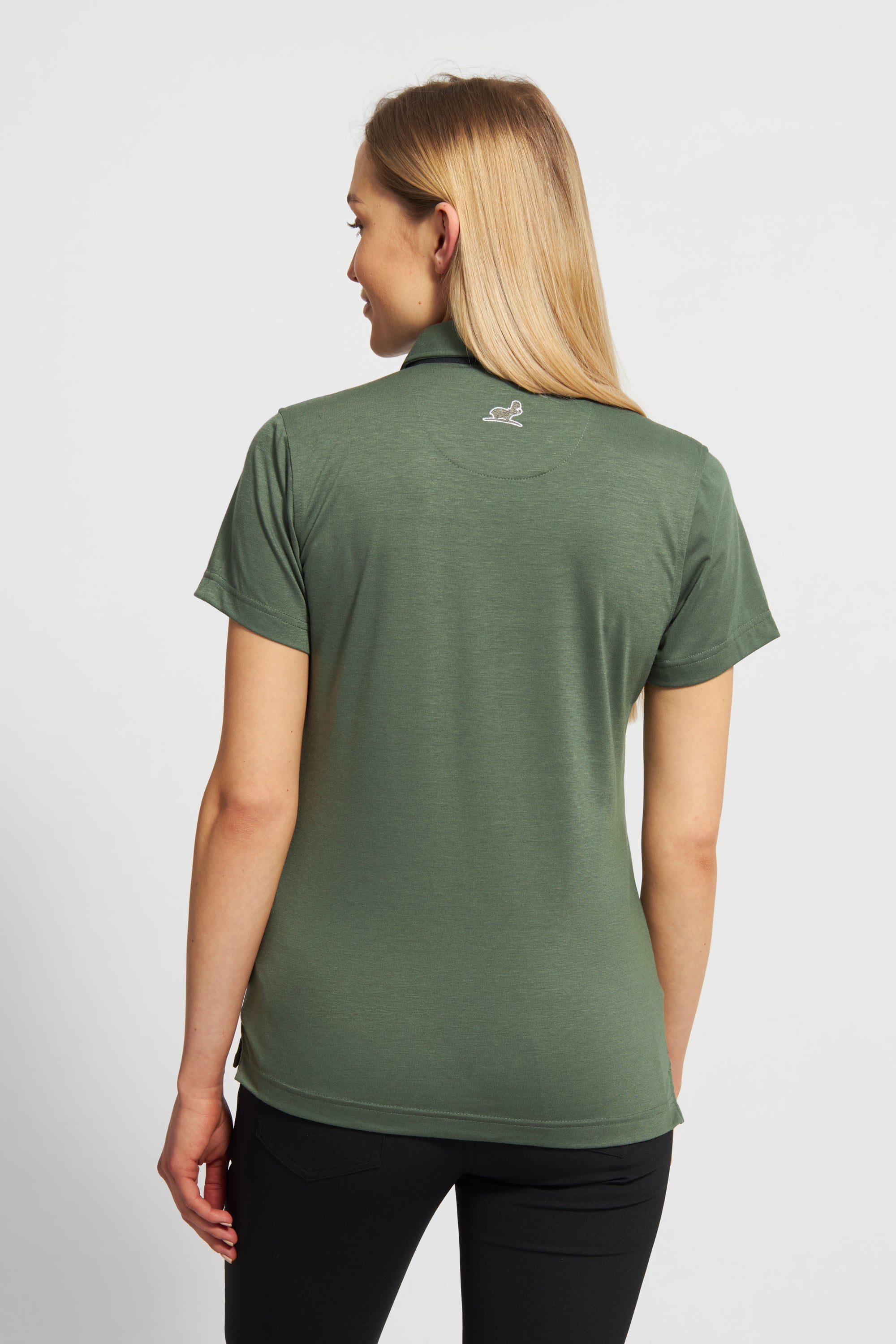 Timjangrön pikétröja i melerad, med en svart detaljerad innerplanka. Supermjuk och lätt med 4-vägsstretch.